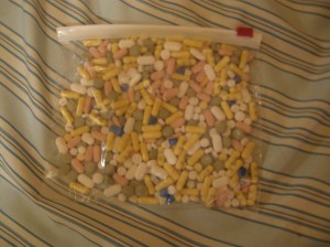 I poured all these out into a baggie. It was a little scary. Not like I was planning to take any of them again. I haven’t had a migraine in seven months, and those drugs didn’t help when I had one. Still, they were expensive.