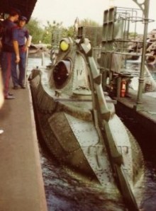 20,000 Leagues Under the Sea, formerly Disney World and Disneyland (RIP): the best ride vehicles of all time. These were actual submarines– on tracks, never underwater more than an inch, but still, submarines. You were underwater. They looked like the Nautilus, outside and in. The portholes were real. The organ music filling that little space, while you sat on your little stool, gazing out at mermaids and the giant squid tentacle and the lost city of Atlantis—I grieve the loss of this ride. I love Nemo’s story, and it made for a great movie, and a great ride. The queue sucked, but it didn’t matter because the ride was so amazing. I miss the hell out of it. (Please also note the dudes running the ride wearing identical uniforms to the seamen in the movie.)