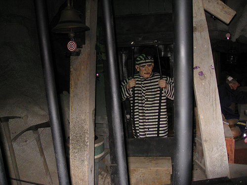 The Flooded Mine, Silver Dollar City: this ride wins for its oddity, longevity, and great dialogue. First, they thought, let’s make a ride where people float through a prison. I would have stopped right there and said, what? But they did not stop. They said, hey, let’s make this prison flooded. But a flooded prison? How could that happen? Hmm. Let’s put it in a mine. I’m not aware of any prisons located in mines, or any prisoners being sent to mines for their work duty, but at Silver Dollar City, the inmates have been engaged in mine work for years. Maybe it’s better than breaking rocks on the chain gang or stamping license plates. Best line: “I’m gettin’ out of here/No matter what!” With the touch of southern accent that lets you know Branson is approaching the south , this line is positively Shakespearean. To me, anyway. After delivering it, a prisoner pushes down on a t-shaped detonator, presumably blasting his way out of the mine with so much TNT.* All this would be enough, would be plenty. But wait—there’s more! The Flooded Mine was converted to an interactive ride some years back. They installed targets throughout the mine, and heavy pistols tethered to the ride boats, so now one spends one’s voyage through the mine shooting at targets, which often set off various reactions. Shoot one target, and a shovel hits a tin pan. Shoot another, and the canary in the cage peeps. Why are there targets in the mine to be shot? In my humble opinion, it’s just because Americans like to shoot at stuff. The icing on this cake is that during Christmastime, all the prisoners wear Santa Hats. Inmates working in a flooded mine in holiday wear. Could it get any better? Only if they let you ride through twice in a row.