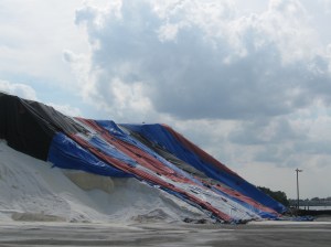 A volunteer let us past the huge fence and gates, past piles of salt as big as whales, through a dark, six-story-high building that trucks must drive through. On some of the salt piles, huge blue tarps to try to keep the salt down.