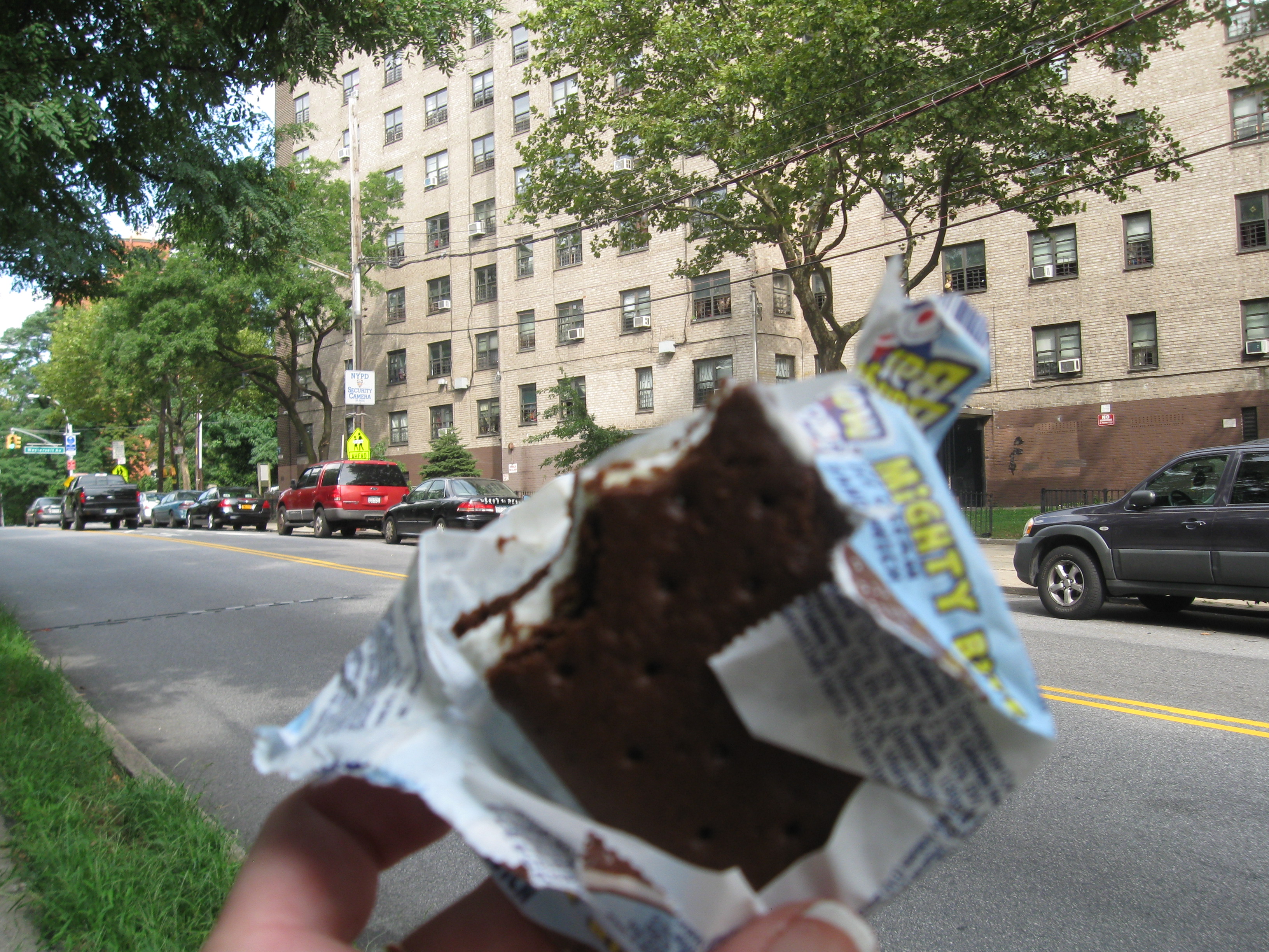 Two ladies are working there, one leaning over the conveyer belt, and one leaning back on it. They are watching television, so deeply they don’t notice me at all. I opened the freezer case and picked out an ice cream sandwich. I walked back over to pay, and they waited a second. Something important was happening in Spanish, in a singing competition. Then the studio audience applauded, and the ladies gasped, and the one behind the counter rang up my ice cream sandwich.