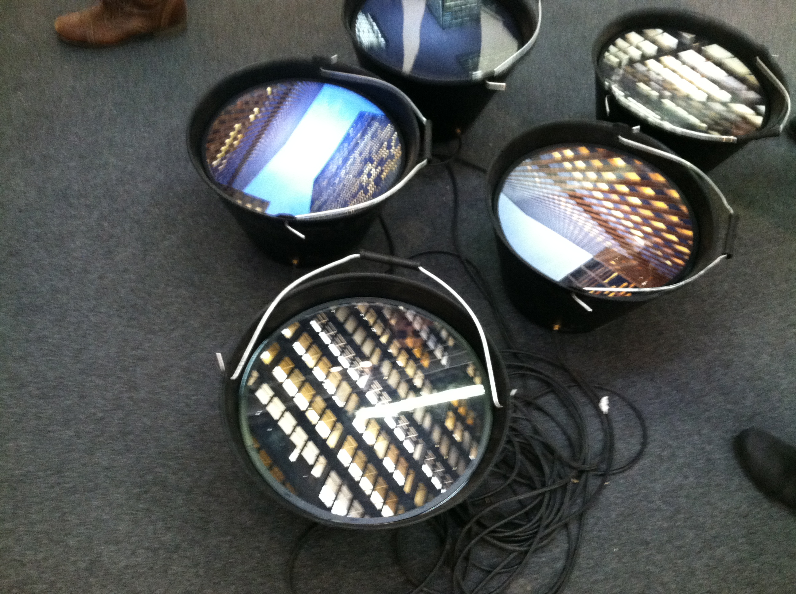 The buckets somehow had screens inside them, with views looking up, so that you would be looking down but looking up. Clever and fun.