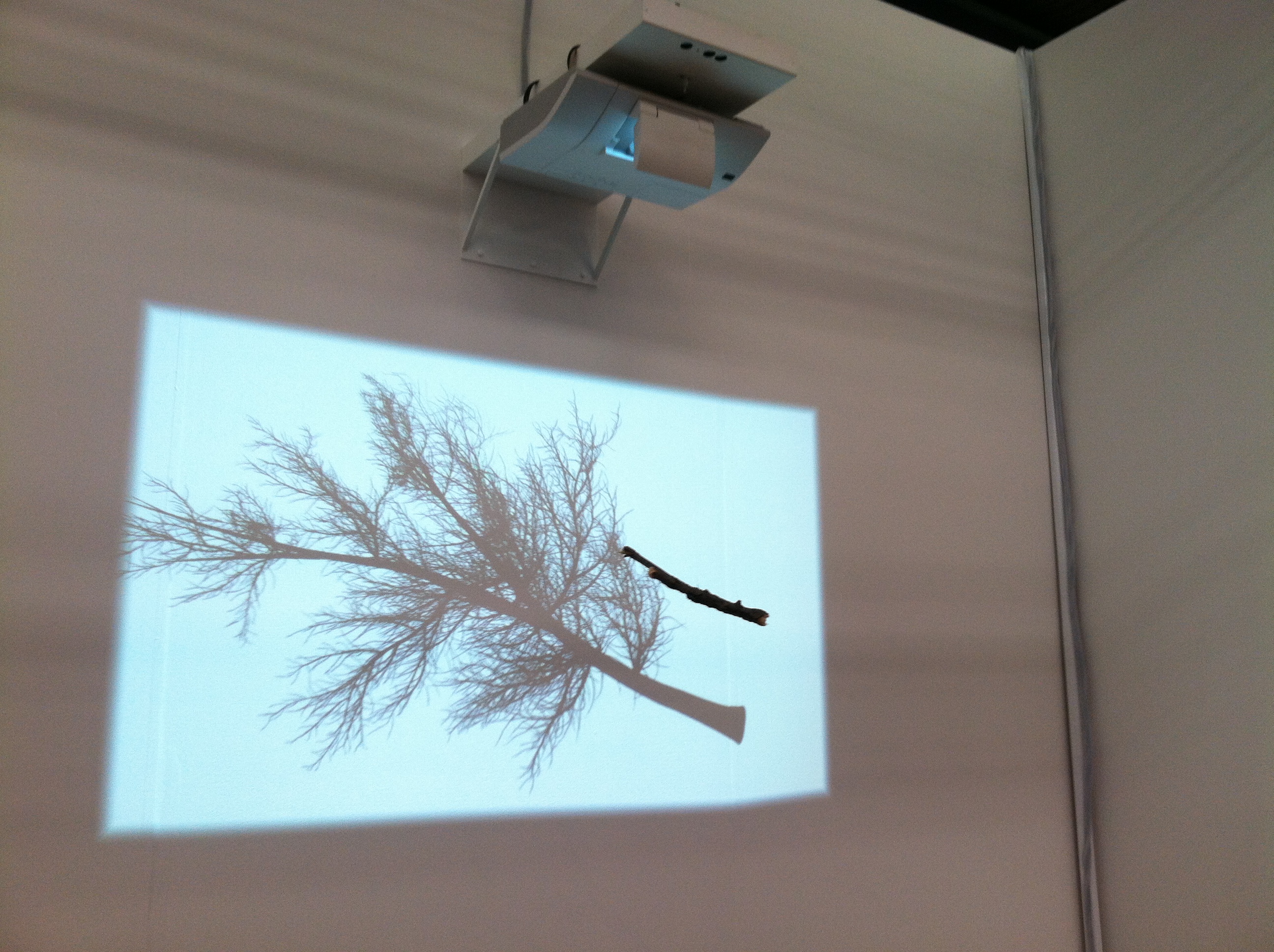 The last one in this entry is a branch rotating slowly, in front of a screen showing a similar branch. The branch behind has its needles and the one in front of you does not. Simple as this was, it was also a crowd-pleaser, showing how things are alive or not alive, or might be alive inside, a nice idea for the early March of a hard winter.