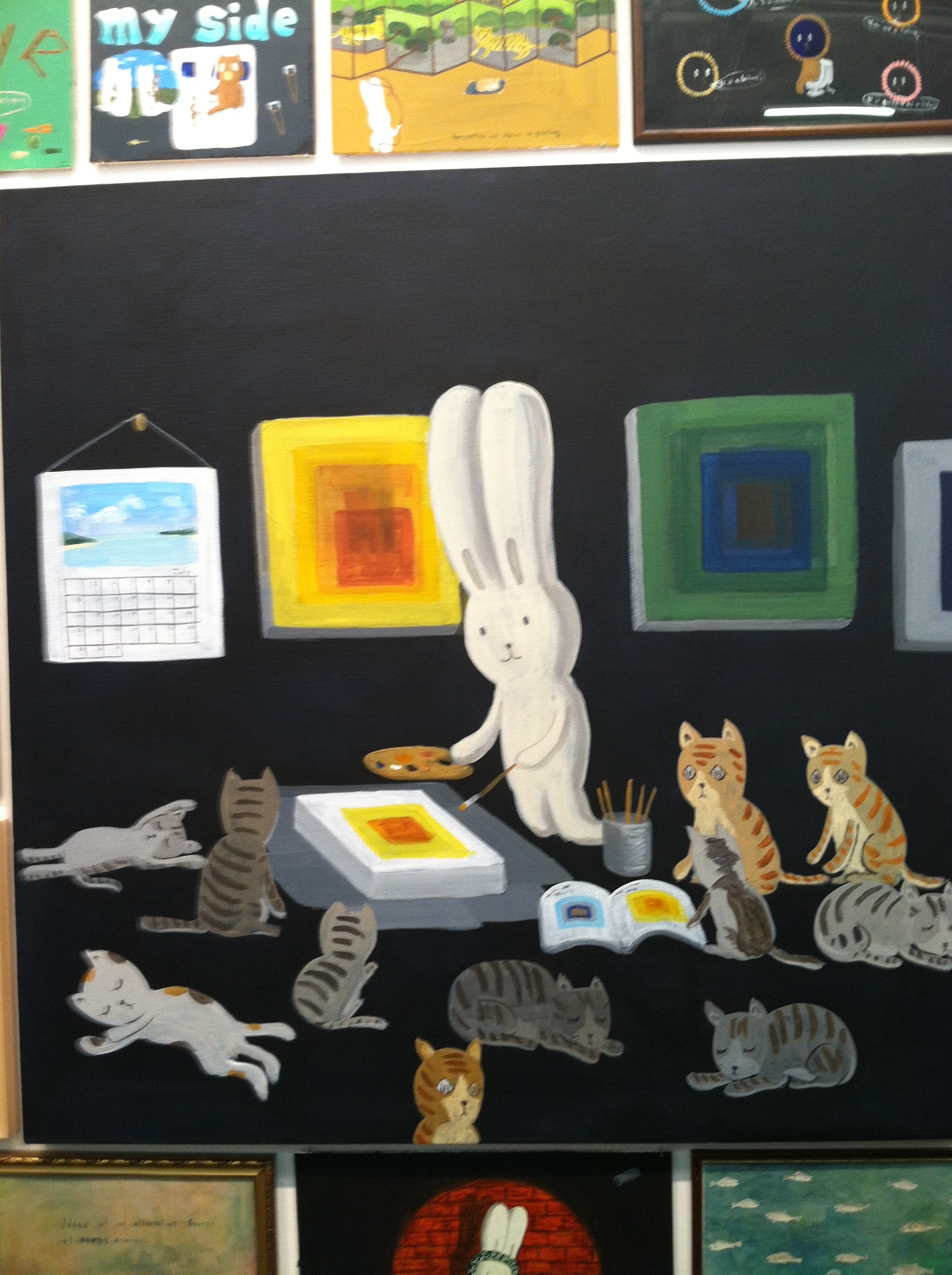 Why does this rabbit trust all these cats? I have no idea, but look at him go. This booth had a whole collage of pieces like that hanging, including one with the rabbit making a sculpture of the cats to go with his painting. One thing that makes me sad is that people are often so serious when they look at art. This was the first silly piece I saw. (That one by Atsushi Kaga.)