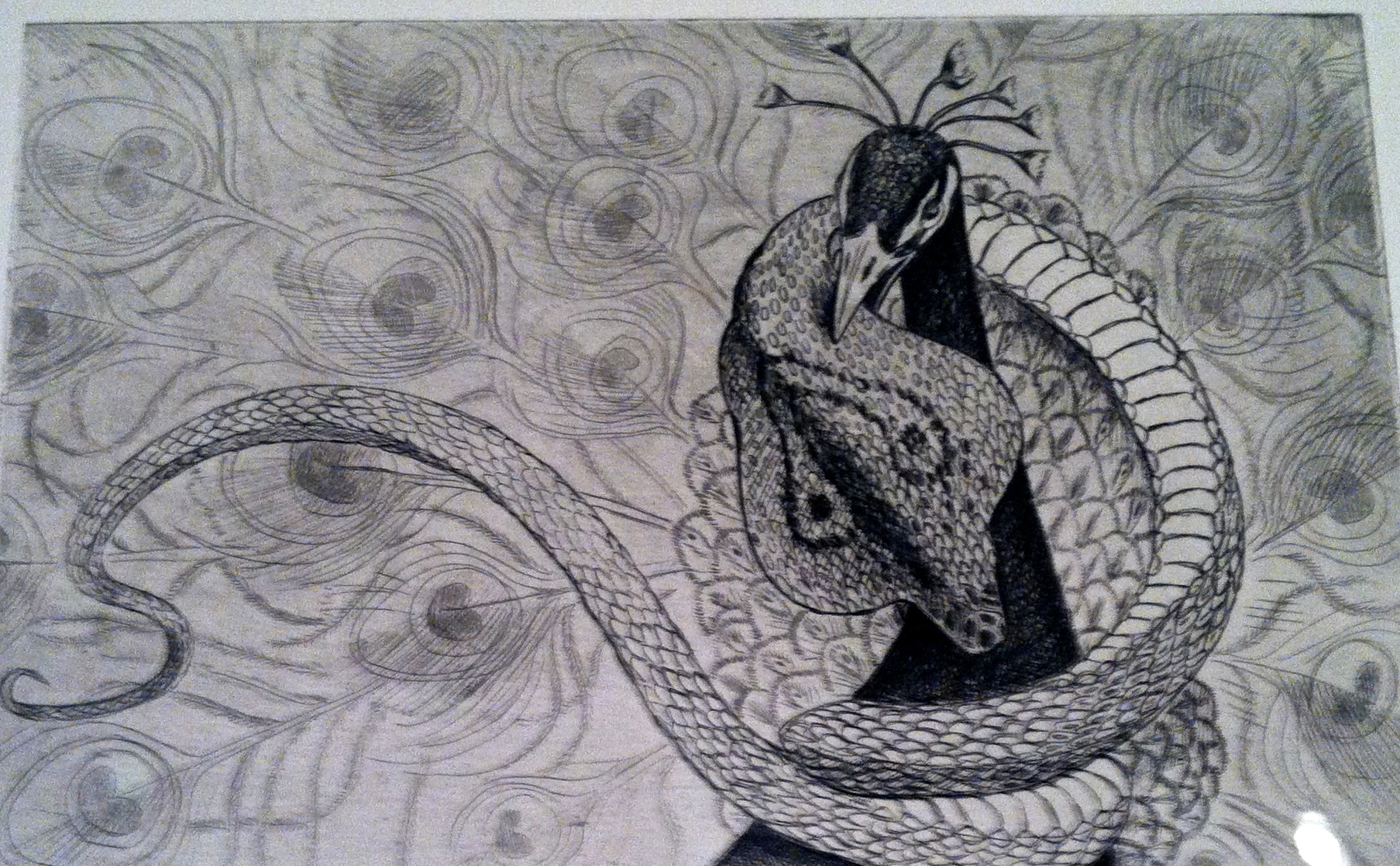 Some time and place is required to let my brain chew on all these questions, and review, as it does in dreams, everything that has happened, what it might mean.  I feel my subconscious is about six months behind my consciousness, most of the time.  Which is what I intended to do some of with the therapist except I was late, and what I can, gentle reader, do here for free.  Tell, and review, or reveal, that I am peacock/cobra now, heavy, delicate, earthbound, defensive, symbol of unrequited love (of various sorts), sharp-tongued, and can I lie?  Liking the plumage.