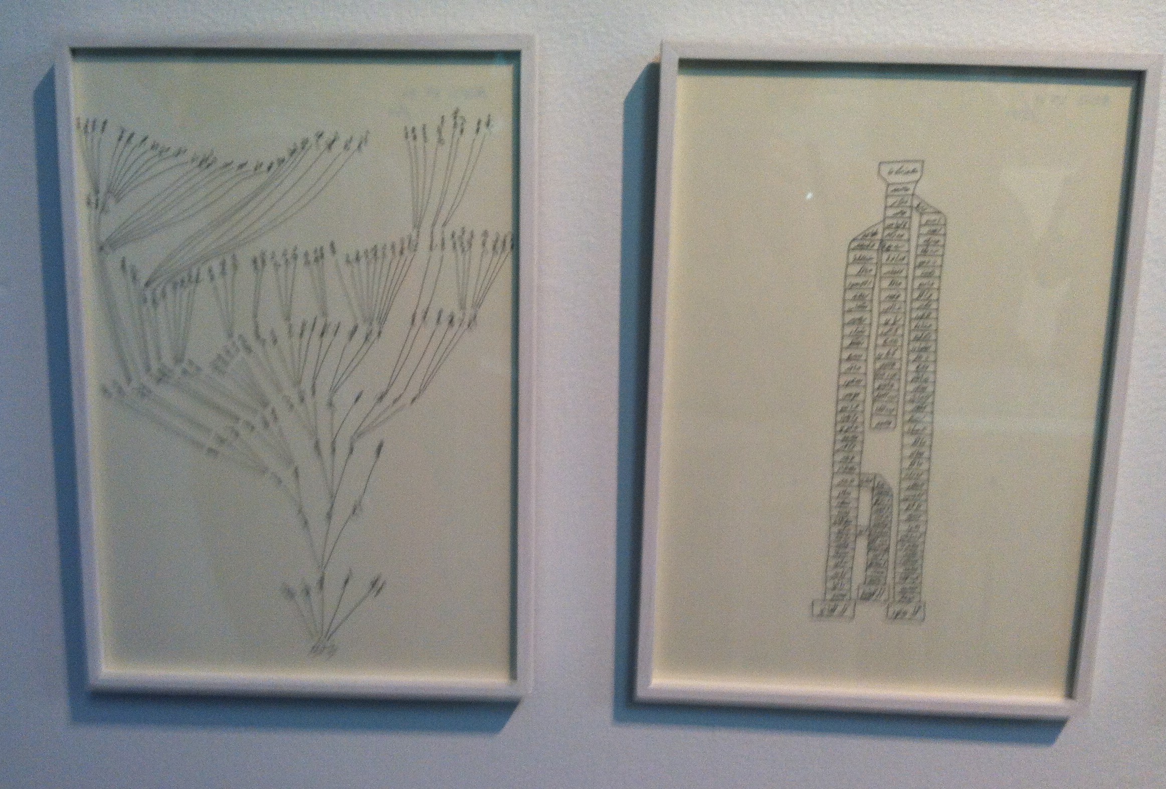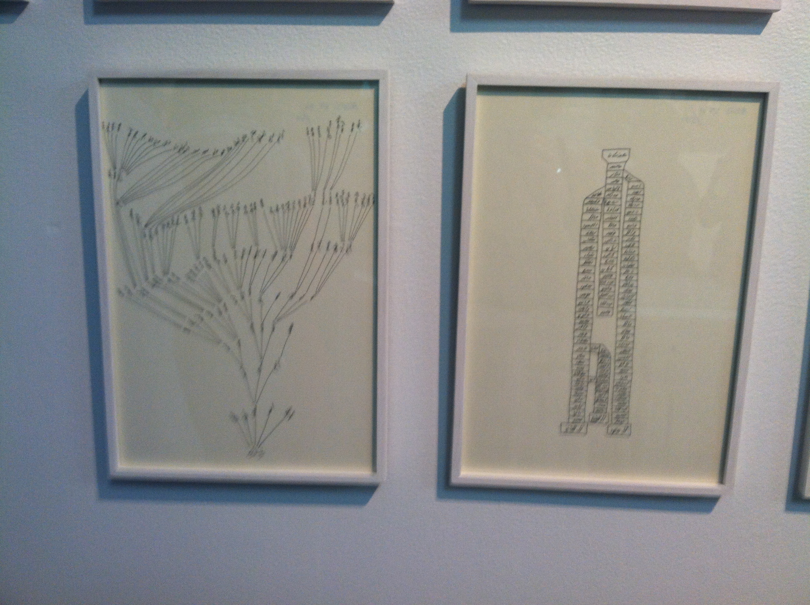Family trees of middle eastern royal families, titled “Probleme” and various numbers. In our country, where your family tree is rarely discussed, and if then, only as a novelty, it reminds that many places, for many people, this charting of who came from whom was critical. Great color, and careful balance of using but not exhausting the idea. Are they molecules? Spreading diseases? Periodic tables? I wished there were more of the pieces that used the shapes of Arabic letters, which I have always loved.