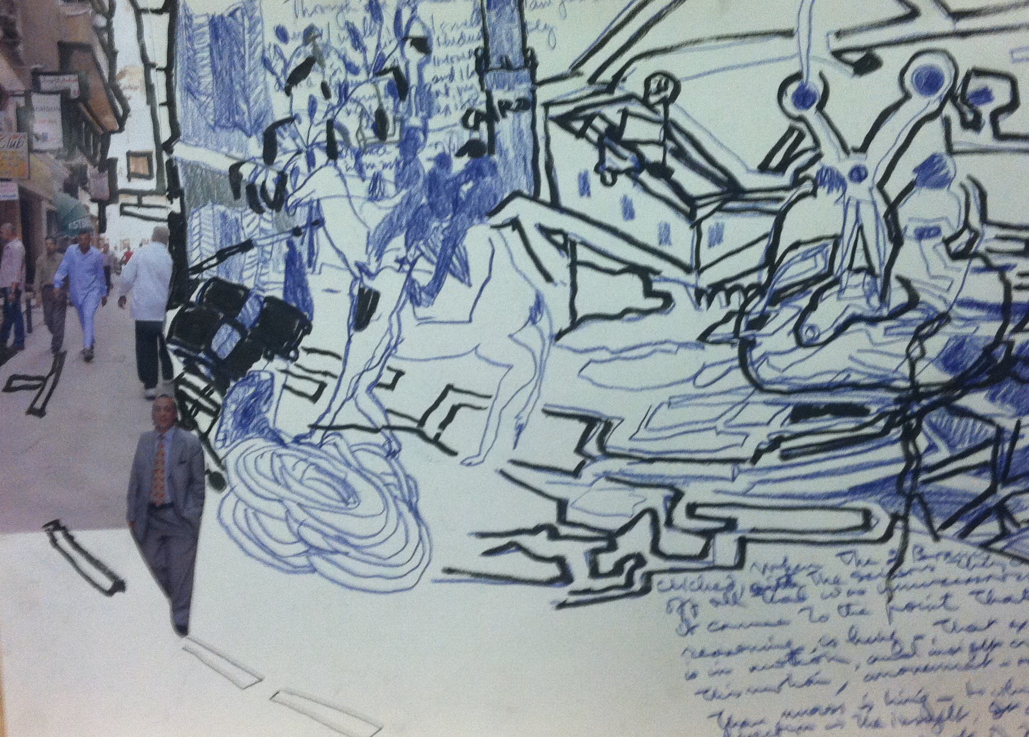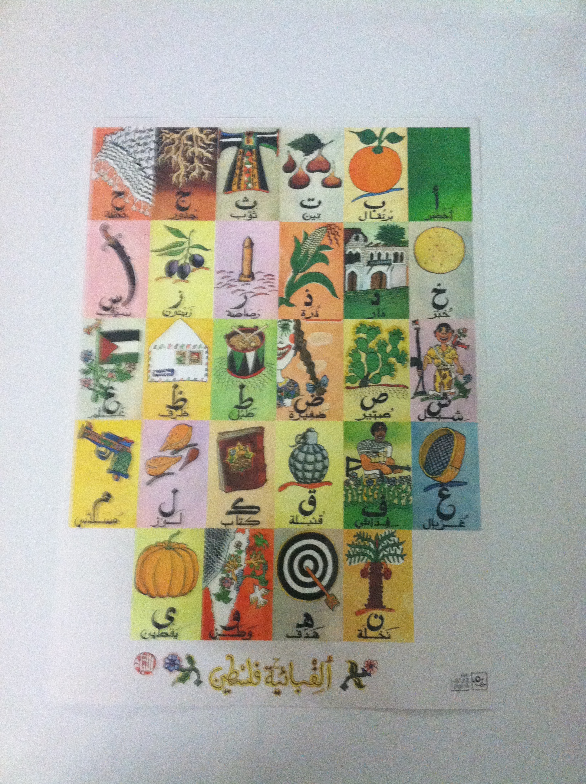many people, just now, would rather talk about money than the middle east. As I was going down and around their narrow white staircase, I thought about the people going down the stairs of the towers, some got far enough, some didn’t. Someone lifted up his kid to see what looked to me like an alphabet of Arabic letters, in great colors, an orange, olives, a braid, a bullet, a grenade. “Those are letters,” he said.