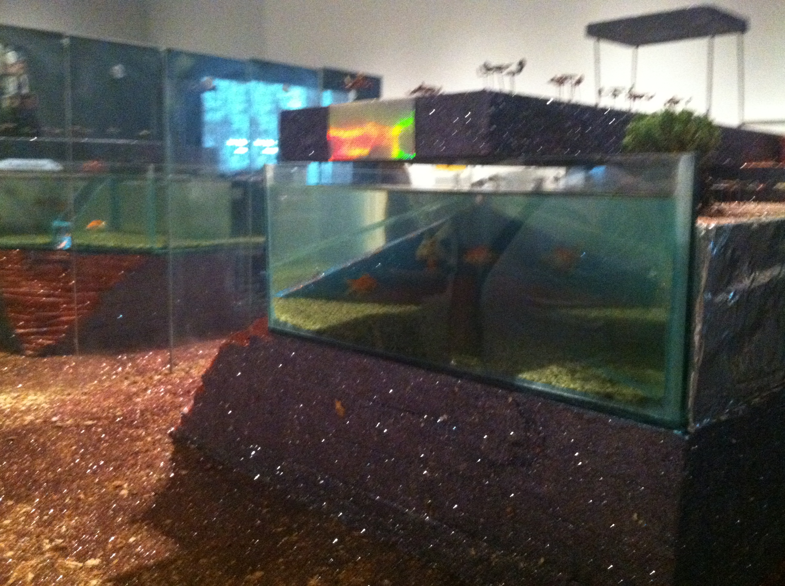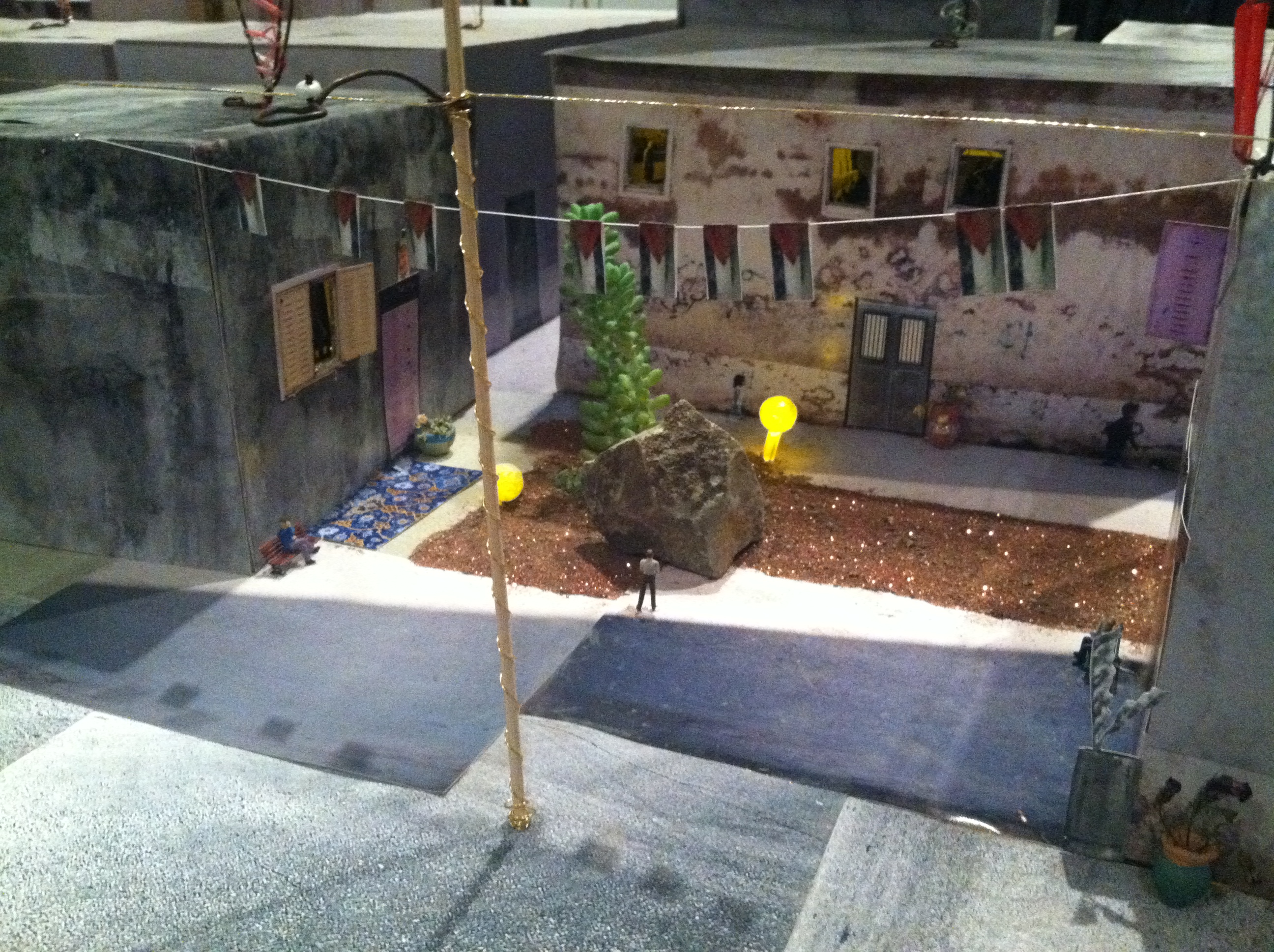 At Disney World, you can see the miniature of Progress City, USA, Walt Disney’s idea for how things should be. It has a ferris wheel. Tiny lights. Places for work and play! Hourani has a similarly whimsical attitude, with his city containing a goldfish pond and music playing, silly, cheerful music. (Those goldfish might be rather dangerous considering the size of the humans in the city, who are about the size of three of these capital Xs.) Someday, that camp will be a place people water potted plants and sit on their rooftops and there will still and always be all those antennae– he seems to have made them out of sparkly pipe cleaners. The sand, dusky brown gravel, has glitter in it, too.