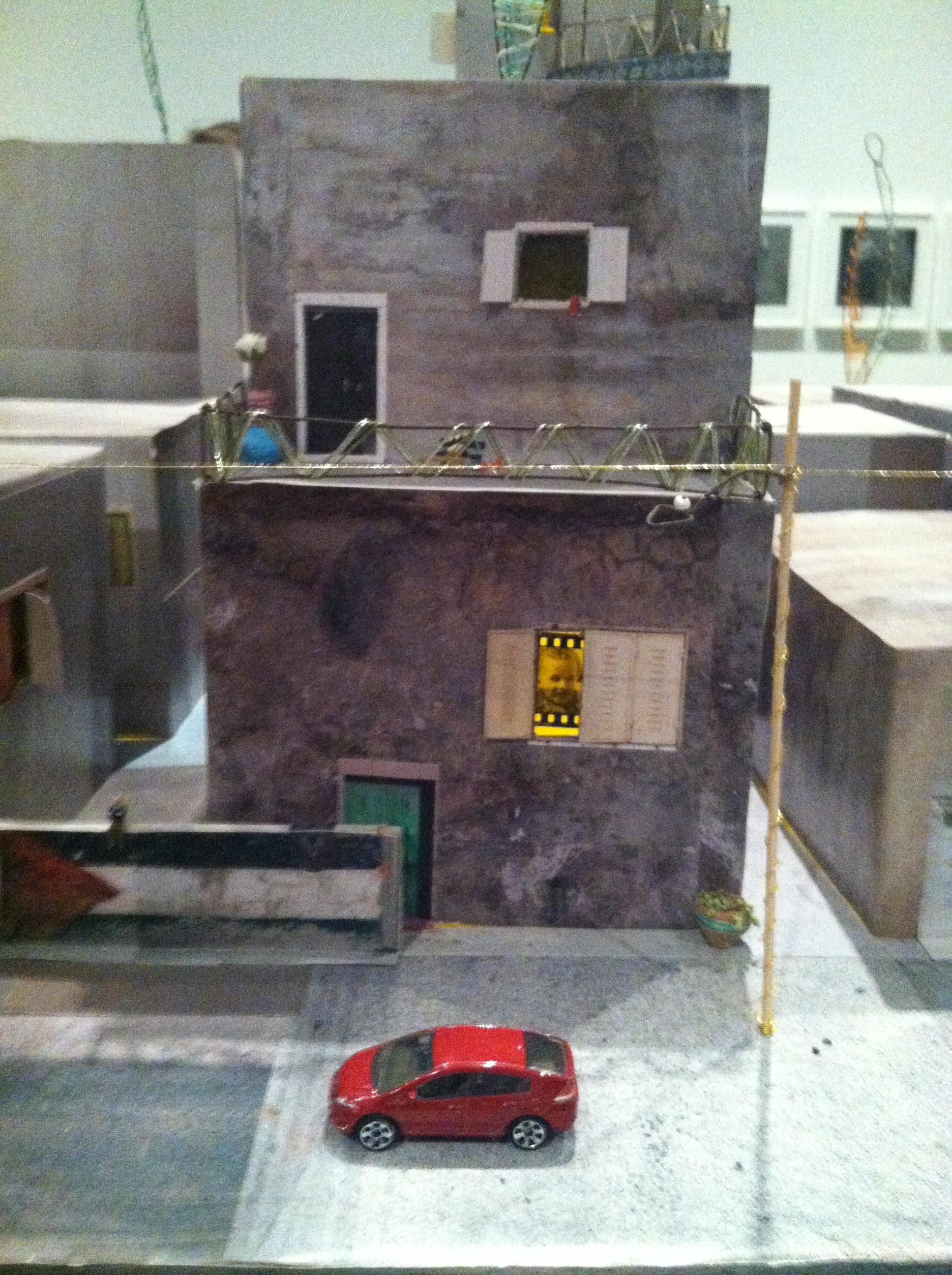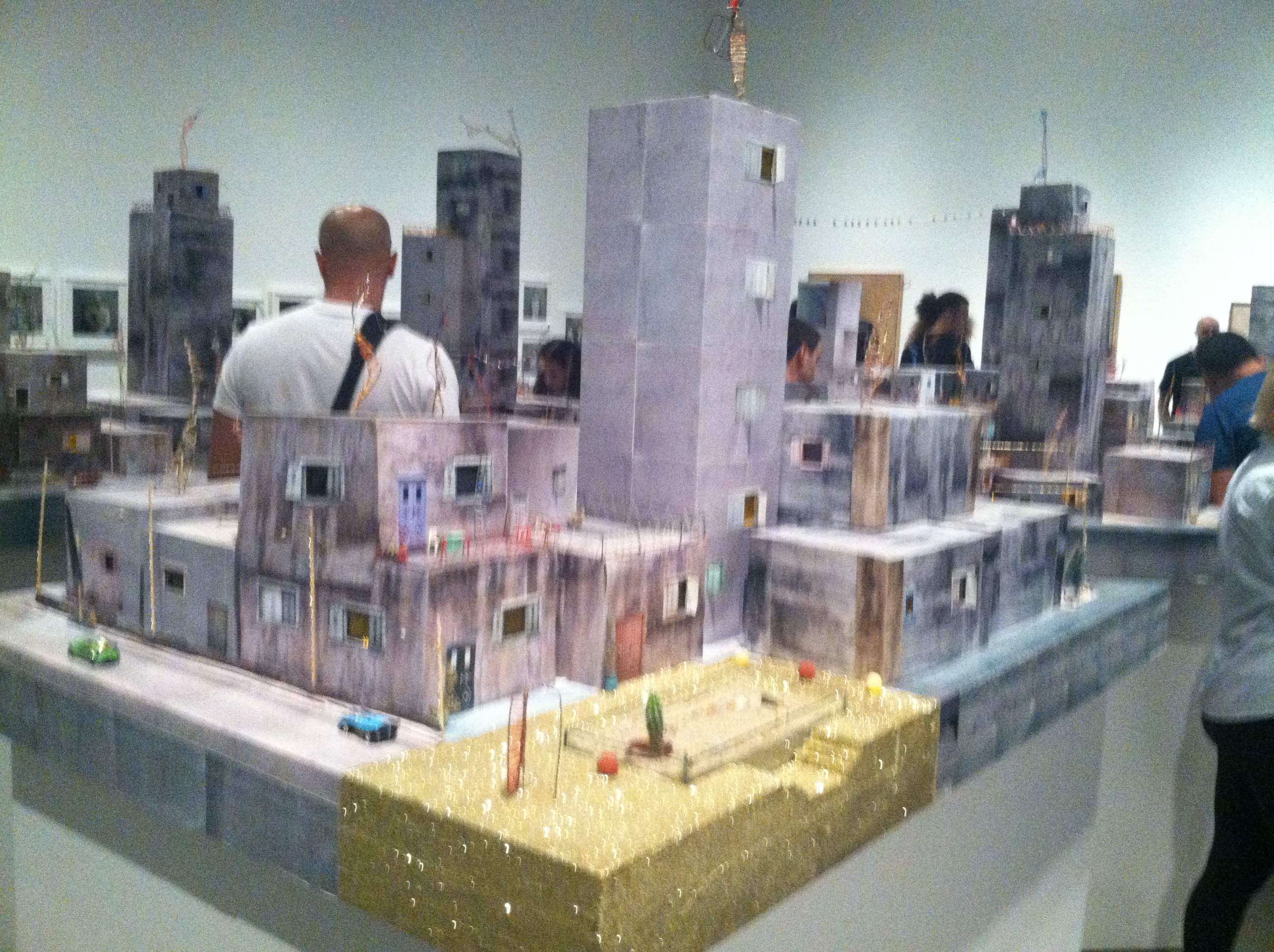 The New Museum seems to have a thing for miniature cities. I loved their last miniature city, by Christopher Burden, and they have another miniature city, this one by Wafa Hourani, called Qalandia 2087, and it “envisions different futures of the Qalandai refugee camp [which was] established in 1959 on land leased from Jordan…though it was originally built to accommodate about three thousand people—Palestinian refugees from nearby villages—its population has nearly quadrupled in the fifty years since” and the tag on the wall goes on to tell you more about the refugee camp and it is, I assure you, depressing.