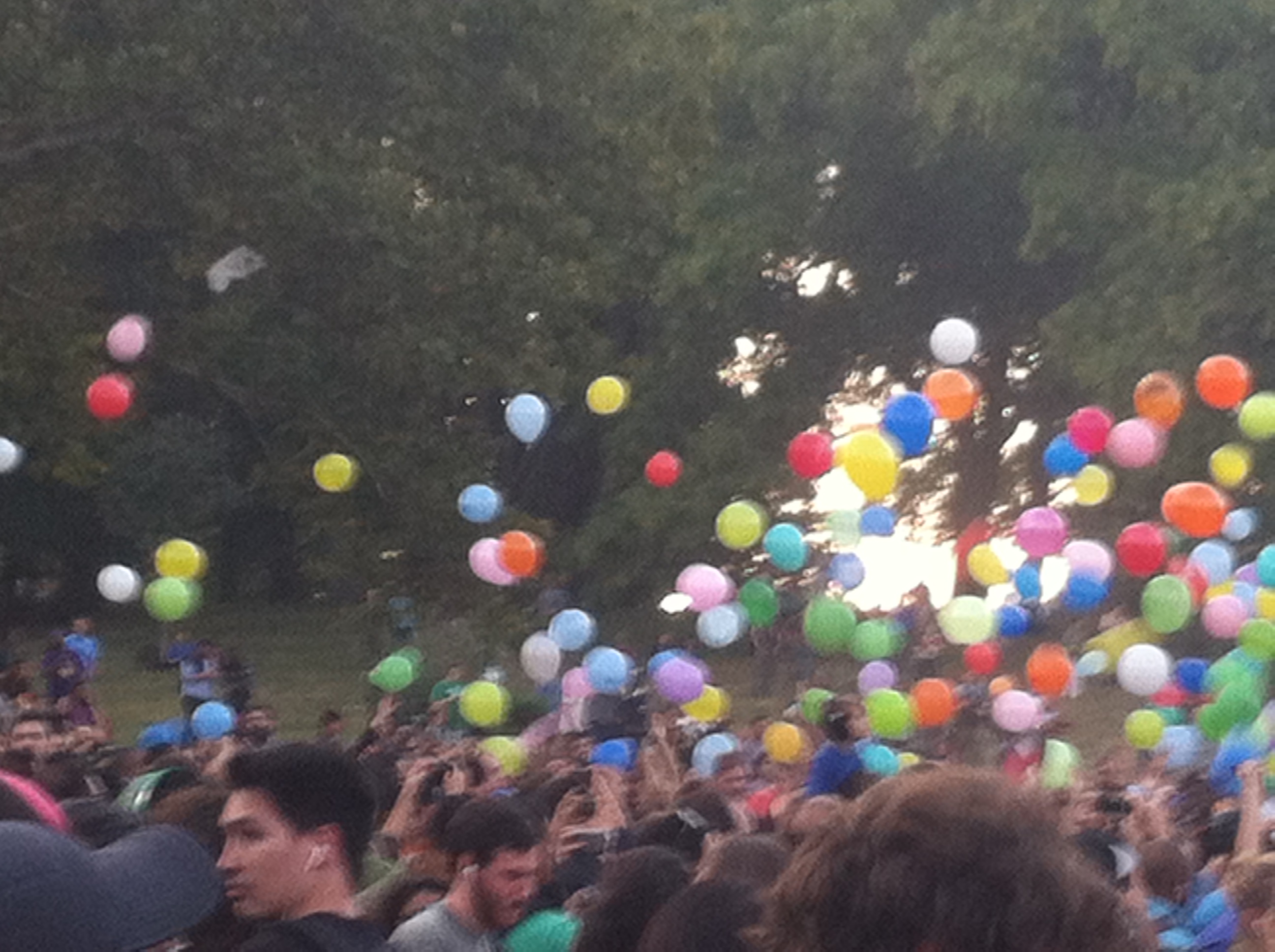 6:41- We blow up the balloons were were assigned to bring. We toss them up.  I love the idea of balloon ball this big, but the balloons quickly drift up the hill, and our section is left without any.  Against the rules of not documenting but participating, we pull out phones and take photos, to console ourselves.