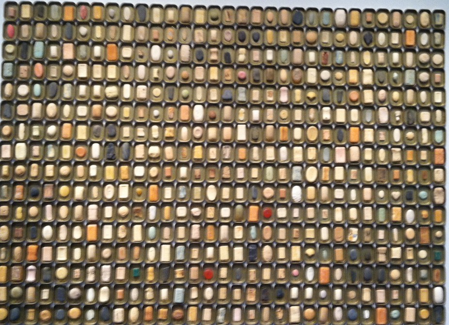 The other piece I loved is a big wall piece made of soap dishes. Most of the soap dishes have worn pieces of soap in them, some of the have stones. The soap, you know, had been held in hands, you could tell.
