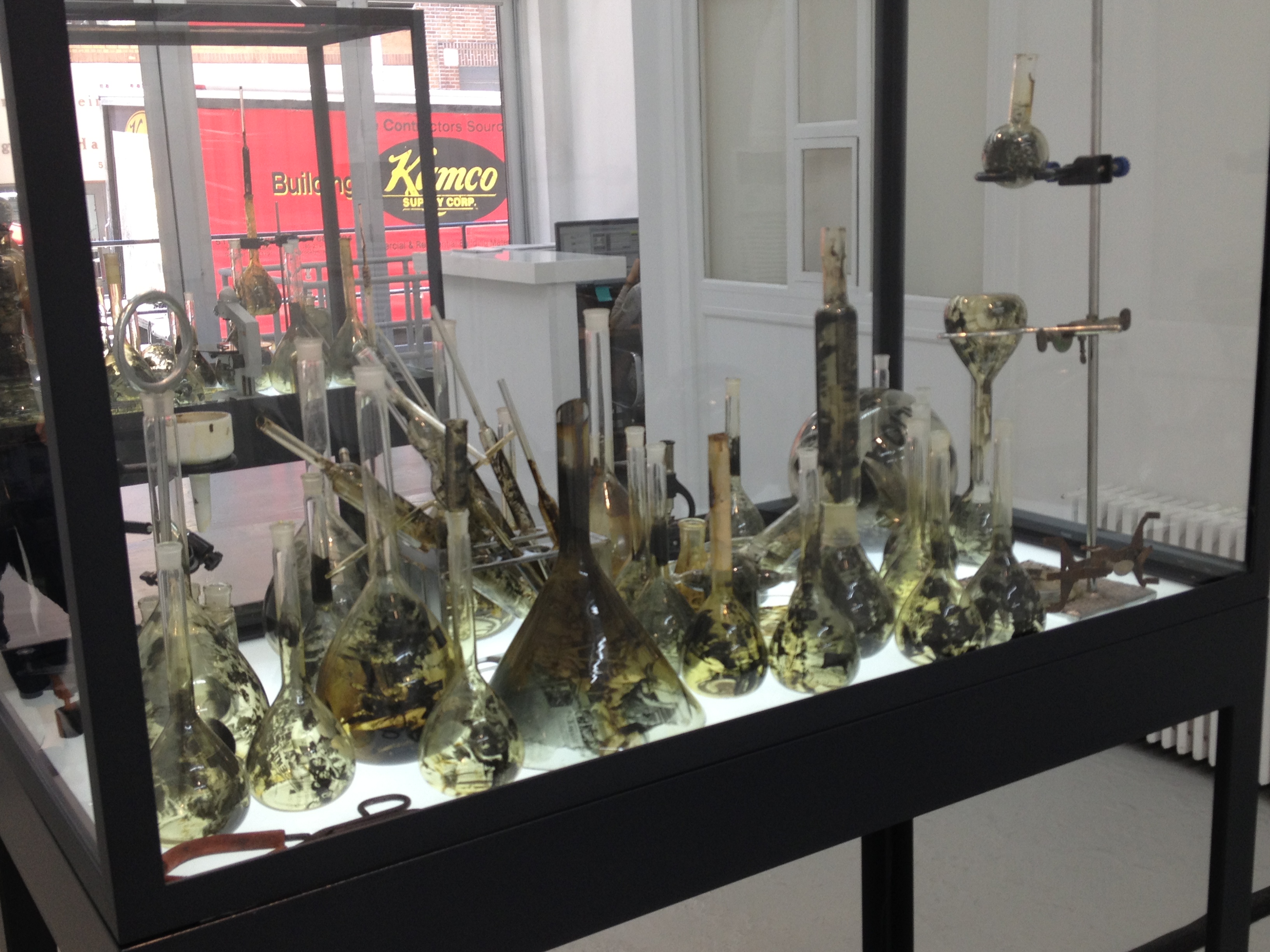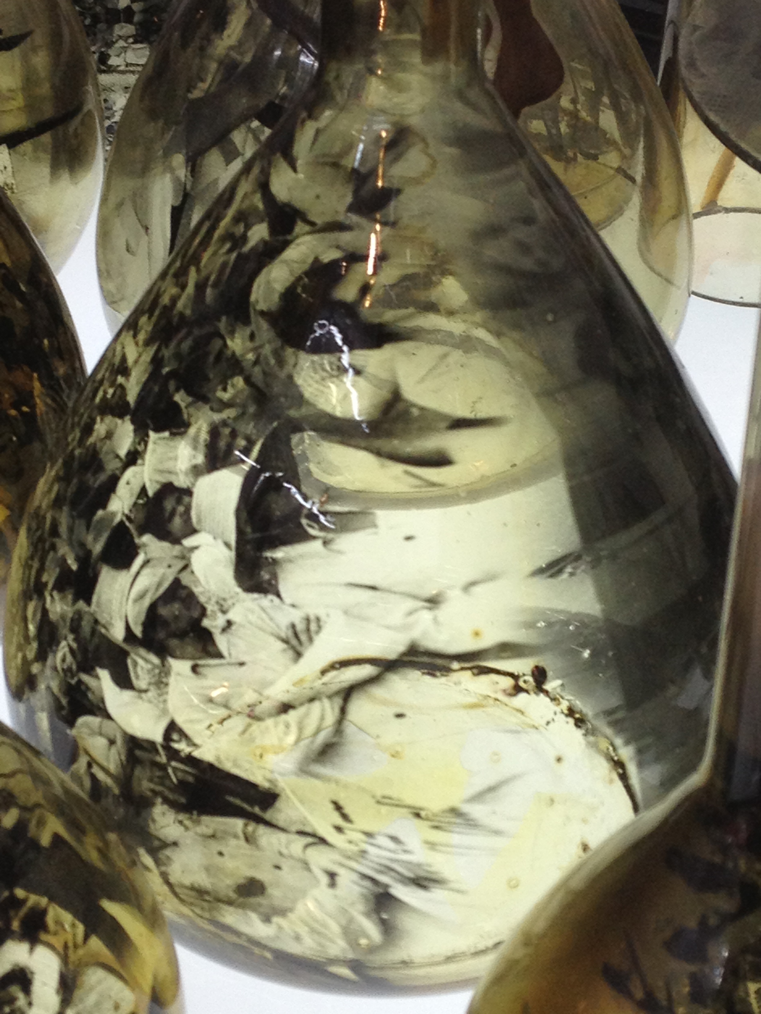 First, laboratory glassware with the ink ghosts of crowds living in it. A whole laboratory’s worth. I used to teach at a school with a great old chemistry lab, and stripped and punched and crumbled as the whole building was, the wood cabinets and the glassware were all there. What was not were the ghosts, ghosts are usually white, but these were black, the images of all sorts of things that had already happened.