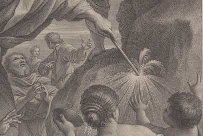Image: detail of “Moses striking the rock with a stick to bring forth water, while the Israelites look on in amazement” by Jean-Baptiste Haussard, ca. 1729, Metropolitan Museum of Art.