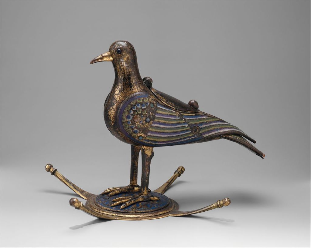 Image: Eucharistic dove, French, ca. 1215-35, Metropolitan Museum of Art. According to their description, “This dove would have hung over an altar as an evocation of the Holy Spirit. A tear-shaped door on its back conceals a small cavity once used to hold the bread of the Eucharist. Though many textual sources mention gold and silver doves, suggesting these materials were part of the standard liturgical furnishings for churches and communities that could afford them, few examples survive. “