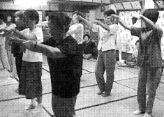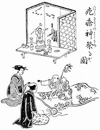 In two villages in Japan, Rokugami and Shimo, women danced a special dance to be friendly to the smallpox demon. If the demon felt welcome, he might also be receptive to being asked to leave. That’s some classic passive aggression. The women wear a purple wrap and white sandals. The drummer wears a red sash. The woman in front carries a big coin on her shoulder and has “Amaterasu Kodaijingu Shrine” written on her left hand. (I must reveal to you that this last paragraph came from a google translate of a page in Japanese, so buyer beware.)
