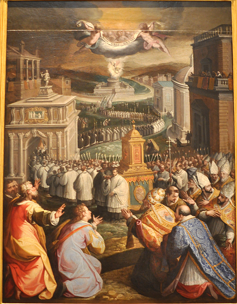 As they marched on, losing people along the way in a manner I find funny the same way I find it funny when one of the rowers in the Roman galley in “Ben Hur” falls over, they approached Hadrian’s Mausoleum. Pope (later Saint) Gregory saw Michael the Archangel putting his sword away, which Gregory figured meant that the plague was over.