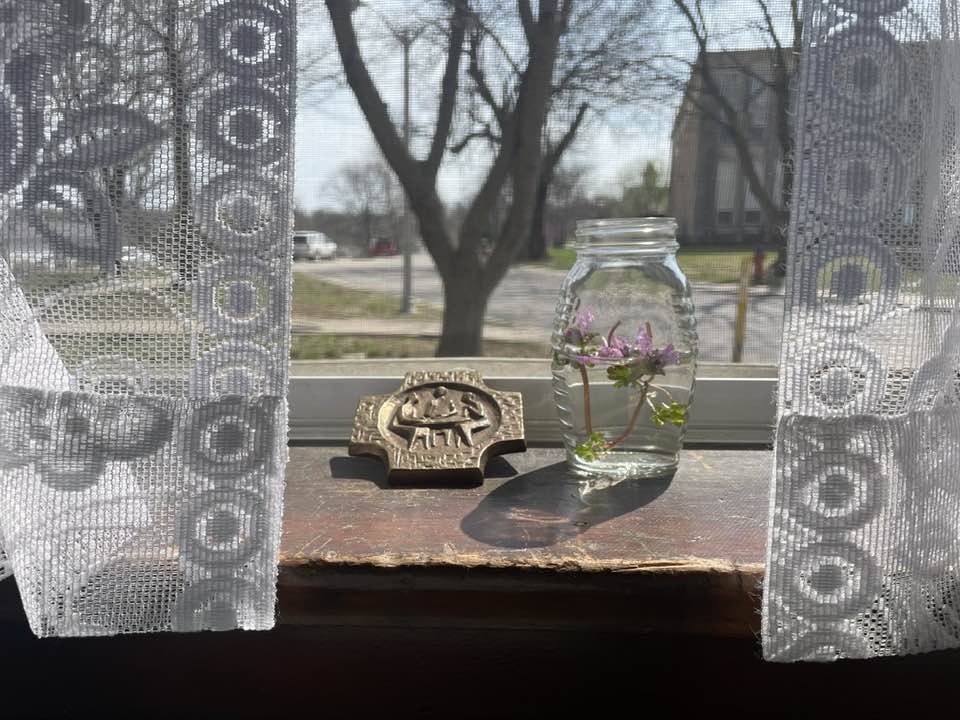 To go to the ceremony for receiving the sister’s ashes, I decided to walk outside. The weather was beautiful. I got to the door to the nursing home part of the building, and I saw all the nuns and a lot of the medical staff standing very quietly. I tried to make eye contact with the receptionist. She walked up. “Where are you going?” she mouthed. I mouthed, “There,” and pointed at the gathering. I had forgotten, but of course the doors are locked to protect sisters with dementia.