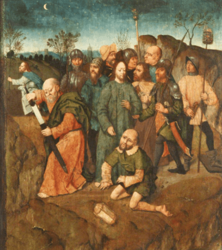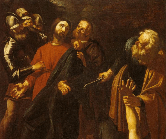 Peter cutting off someone’s ear is in all four of the gospels. They call him “Malchus.” It was part of the tradition that all four groups (represented by the four texts) found significant. Peter’s so pissed off that he lashes out at the lowest man on the totem pole, a slave. Peter’s so pissed off he becomes what he hates.