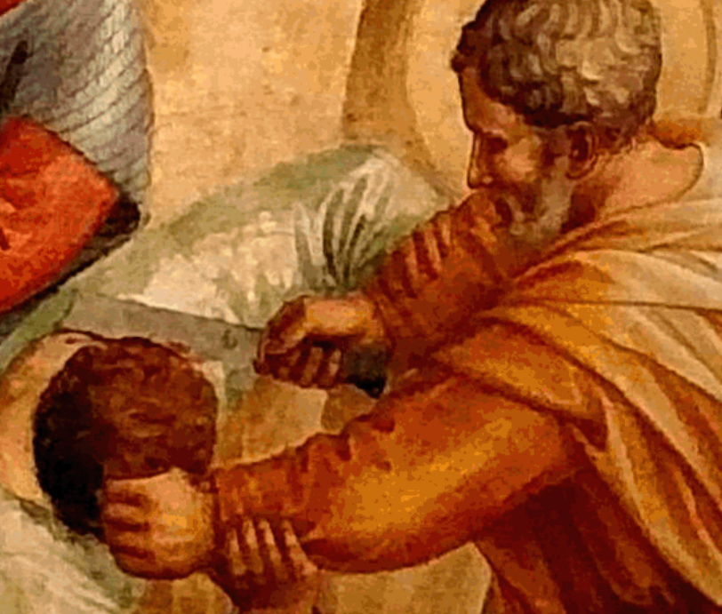 Okay, this is also the grisly version. This is what it would look like to cut off someone’s ear. This Peter has cut up a lot of fish, and he might be a Hell’s Angel. Cutting off an ear with a knife this size seems way more doable than using a whole sword. Duccio di Buoninsegna painted this one in the late 1200s or early 1300s.