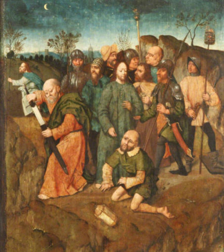 I also enjoy this portrayal, with Peter putting his sword away like, “Hunh!” Jesus holding an ear in his hand like, oh, boy, let’s get this back on, and Malchus’ face looking unbothered. The painter (Michel Sittow, 1469–1525) has made a bunch of other expressive faces, but Malchus looks like he’s getting a school picture taken. I guess he’s in shock.